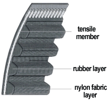 同步帶通常由三部分構(gòu)成:即強(qiáng)力層,齒膠層以及齒布層組成。